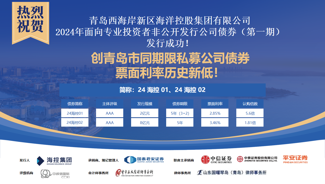 3月4日,海控集團成功發(fā)行2024年面向專業(yè)投資者非公開發(fā)行公司債券(第一期),票面利率創(chuàng)青島市同期限私募公司債券歷史新低。